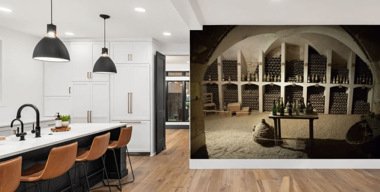 donkere aanpasbare wijnkelder behangmuurschildering genaamd Wine Racks by Image Source voor restaurants, keukens en kelders