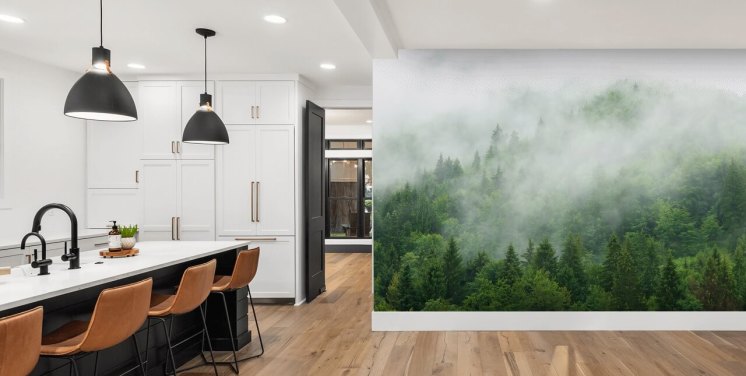 groen-witte op maat gemaakte berkenboombehangmuurschildering genaamd Fresh Forest Green van James Wiens voor slaapkamers
