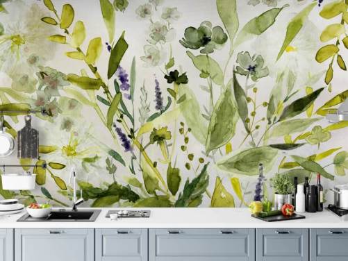 groene aanpasbare plantenbehangmuurschildering genaamd Olive Green Plants van Carol Robinson voor keukens