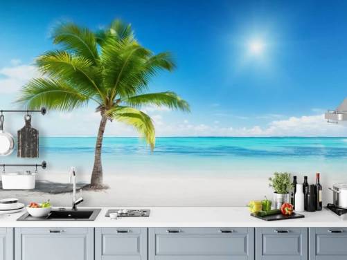 blauw-witte op maat gemaakte strandbehangmuurschildering genaamd Palm and Sea voor thuis of op kantoor