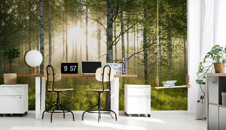 Åpen planløsning betyr også multifunksjonsområder. Hvis du kombinerer områder i en åpen planløsning, kan en vegg med et forfriskende veggmaleri umiddelbart forbedre den. Hvorfor ikke balansere utendørs med et veggmaleri som utfyller naturen og skaper en ekte wow-faktor i et arbeidsområde? Denne skogdesignen gjør jobben!