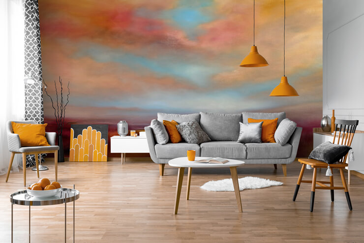Denne kule eterdesignen balanserer tremøblene i rommet med rolige akvarellfarger. Det viser også at du fortsatt kan plassere møblene dine i forgrunnen uten at det påvirker tapetet. Fargene og teksturene fungerer med en kunstlignende følelse på veggen.