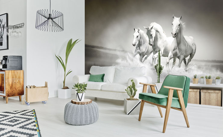 For et helt annet hestetapet, velg dette drømmende Horses Black & White veggmaleriet. Innredningen i dette rommet utfyller dette hvite hestemaleriet fullstendig. Det hvite og grå tilbehøret speiler tonene i designet, mens innslagene av grønt fra plantene, lenestolen og puten gir et jordisk fargeklatt i rommet.