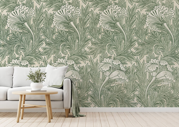 Hvis du er en ivrig historieentusiast, kan et viktoriansk tapet være noe for deg. Med et respektfullt nikk til en spennende tid i historien vil tekstildesignene hans fra 1800-tallet gi det perfekte vintagepreget til ethvert rom. Dette tapetet med kaprifolmønster er ikke bare viktoriansk, men det er også lett å se Morris' lidenskap for middelalderhistorie, arkitektur og kunst. Det botaniske trykket kunne lett ha vært hentet fra et middelaldersk glassmaleri. Sammen med en moderne grønn fløyelssofa og tørket pampasgress har dette antikke tapetet blitt brakt inn i det 21. århundre i denne trendy salongen.