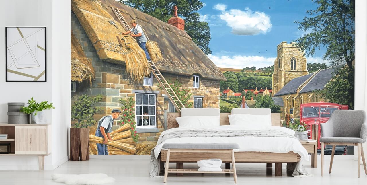 Har du noen gang slukket et hyttetak? Eller bodde du i en stråhytte? Kanskje du fortsatt er heldig nok til å leve i en? Uansett grunn har trukket deg til denne fantastiske A New Thatch veggmaleri, er vi sikker på at du vil absolutt elske denne nostalgiske designen. Minner om en vakker barndom i den engelske landsbygda...