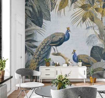 grå illustrert påfugler tapetveggmaleri kalt Peacocks Clan 4 av Andrea Haase for soverom og stuer