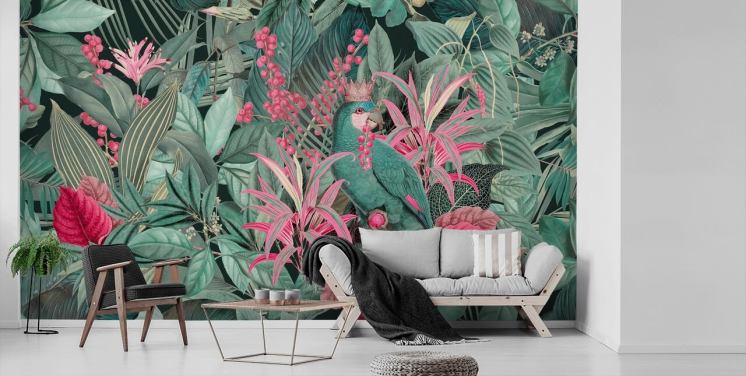 grønt og rødt tilpassbart jungel tapetmaleri kalt Parrot King av Andrea Haase for soverom