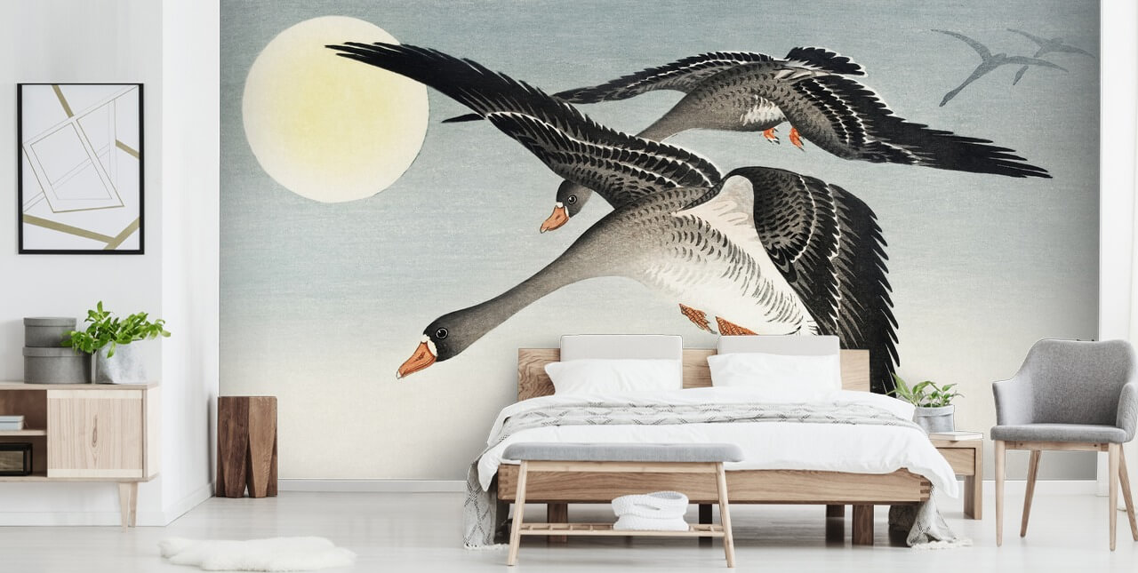 Elsker villgjess? Vil du ha en funksjon vegg for soverommet ditt? Så hva med å nyte denne fantastiske Birds at Full Moon tapet i hjemmet ditt?