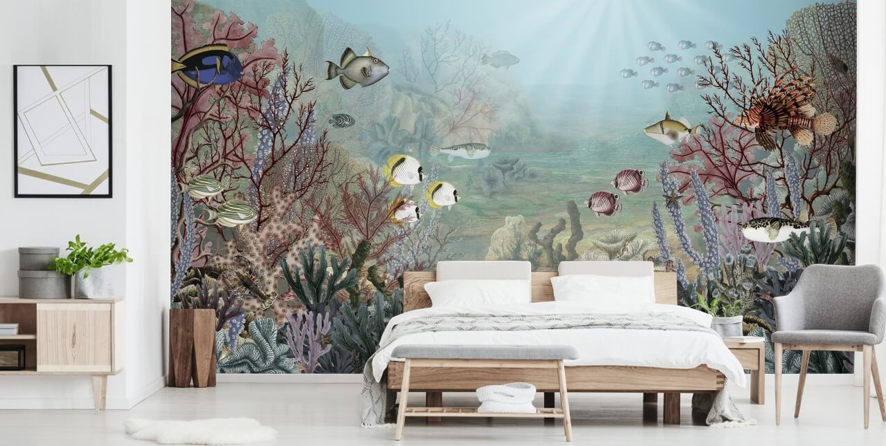 Installer denne vakre Coral Creatures tapet og legg til et stilig utseende til hjemmet ditt. Vi elsker pastelltoner og vintage illustrasjoner av den fantastiske koraller og fisk.