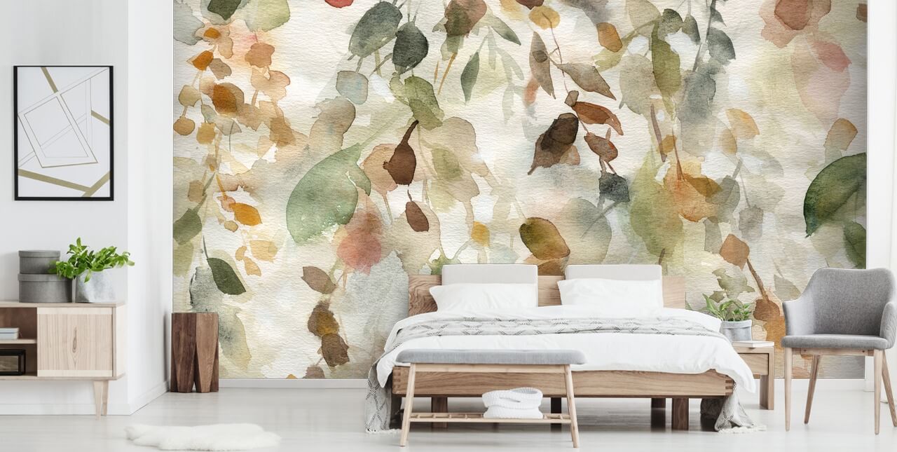 Gi skjønnhet til veggene dine med dette målrettede Fall Cascade-tapetet fra Wallsauce.com. Hvorfor ikke installere dette ganske nøytrale tapetet på veggen på soverommet ditt? Mal veggene i en off-white tone, men få inn en fargeklatt med et terrakottahodegjerde. Få frem de brune og salviegrønne nyansene ved å velge spredte puter i samme farger.
