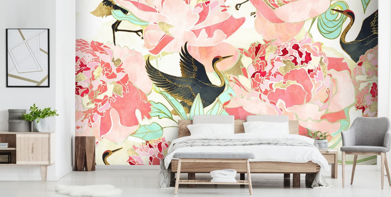 Finn perfekt rosa og grønn veggkunst med denne vakre Floral Cranes tapet veggmaleri fra Wallsauce.com! En fabelaktig Space Frog Design!