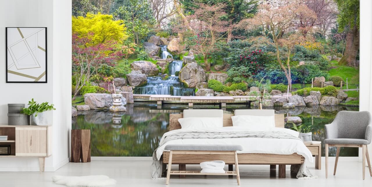 La fargene på trærne trekke deg inn og oppdage de vakre elementene dette veggmaleriet har å tilby. Det er så mye å oppdage, fra flytende fossefall, blomsterblomstrer, japanske inspirerte formasjoner og beroligende strekninger av vann.