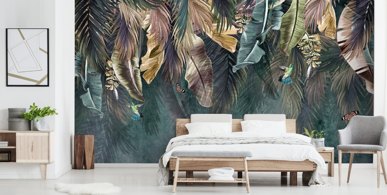 Dette tapetmaleriet med blått blad er en fin måte for deg å bringe farge og karakter til et vanlig rom. Når du bestiller veggmaleriet Hanging Tropical Palm Trees Blue, husk å legge til litt ekstra til veggens mål slik at den kan trimmes til perfeksjon under installasjonen.