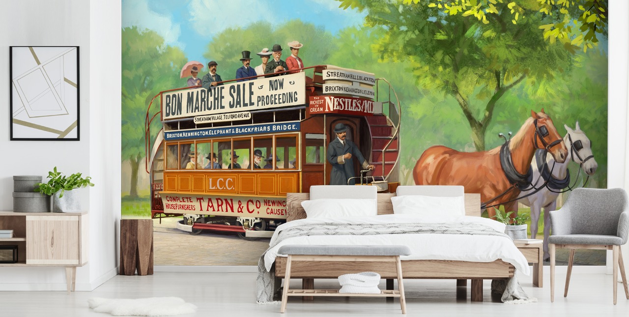 Forvandle enhver vanlig vegg med det vakkert fengslende Horse-Drawn Tram tapetmaleriet av Daniel Rodgers.