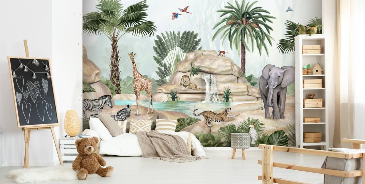 Gå inn i jungelen med dette fantastiske Jolly Jungle tapetmaleriet fra Wallsauce.com! Det perfekte søte dyretapet til ditt barns soverom!