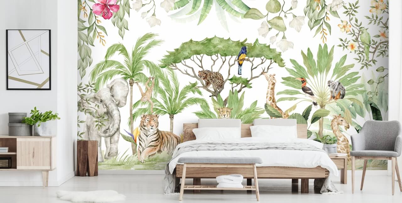 Gi hjemmet ditt en makeover med denne søte Jungle Fun Light tapet veggmaleri. Skreddersydd for å passe veggen.