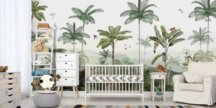 grønt og brunt veggmaleri for barn kalt Playful Robins - Vintage Green av Kikki Belle for barnehagevegger