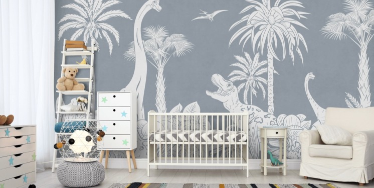 blå og brun barnehage veggmaleri kalt Playful Woods - Vintage Blue av Kikki Belle