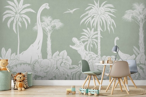 grønt tilpassbart lekerom veggmaleri kalt Playful Robins - Monochrome Green for barnehager
