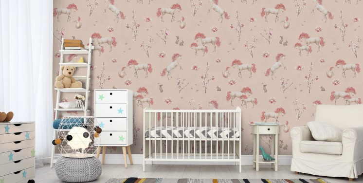 rosa og grønt tilpassbart barnehage veggmaleri kalt Playful Woods - Pink av Kikki Belle