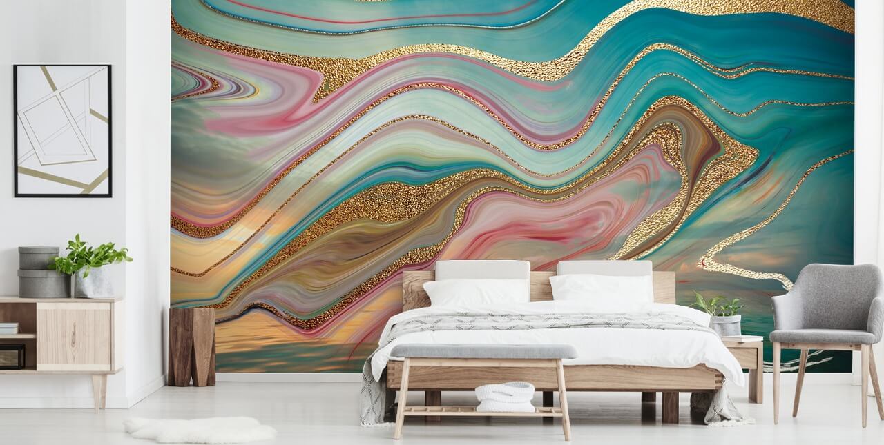 Har du en skjønnhetssalong eller frisørsalong? Tenk deg dette psykedeliske tapetet på veggen. Vi er ikke i tvil om at kundene dine vil komme tilbake igjen og igjen til ditt trendende etablissement. Velg pastellrosa eller kremsitteplasser og vurder å velge innredning med gull aksenter for å speile gulleffekten i veggmaleriet. Gullinnrammede speil er et absolutt must.