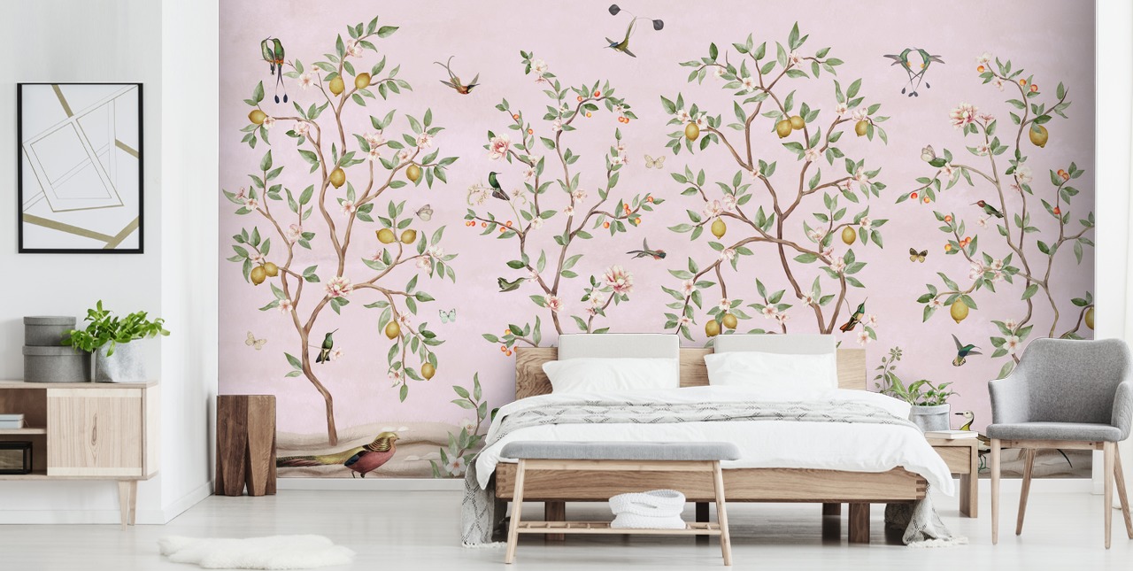 Handle dette vakre Lemon Tree Chinoiserie veggmaleriet i rosa og forvandle soverommet eller stuen din.