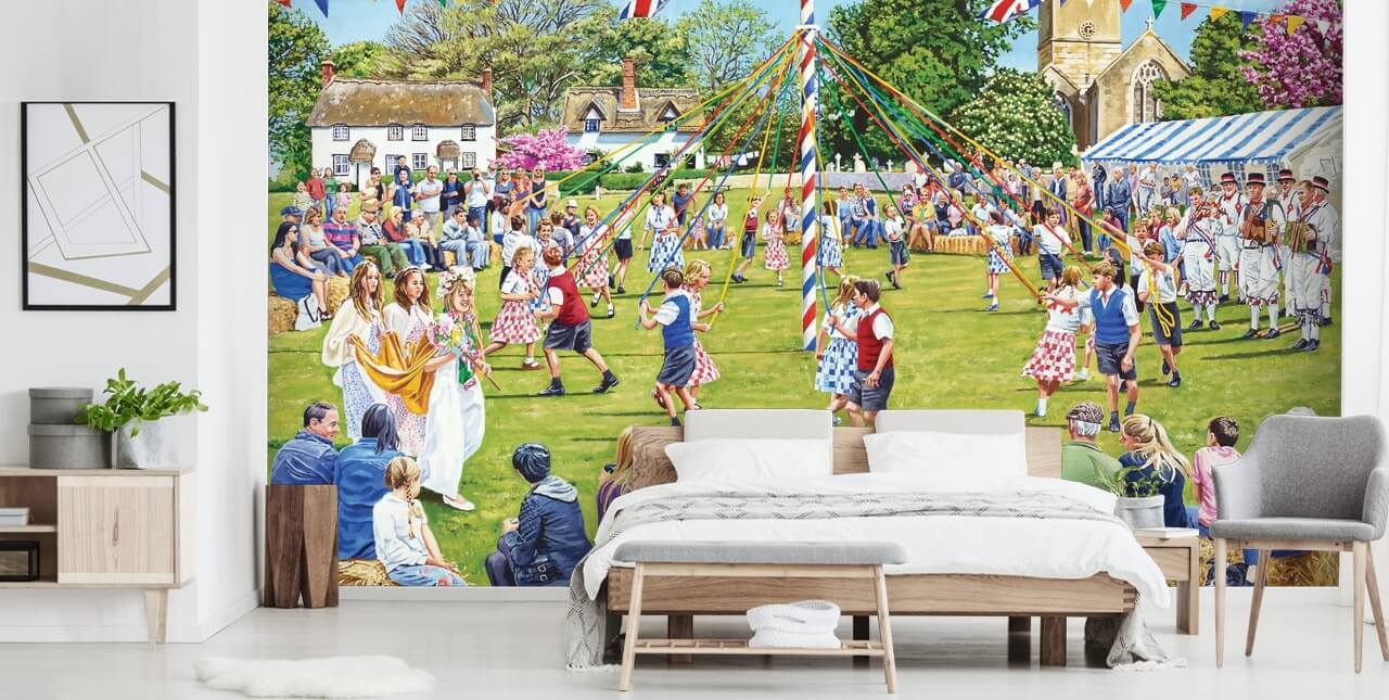 Flott for de som elsker engelske tradisjoner, ønsker å bringe tilbake gode minner, eller skape et snakkepunkt i et omsorgshjem, denne mai Day Feiringer tapet har alt. Og jo mer du ser, jo mer ser du virkelig! La du merke til Border Collie-hunden? Mønsteret til maypole dansernes kjoler?