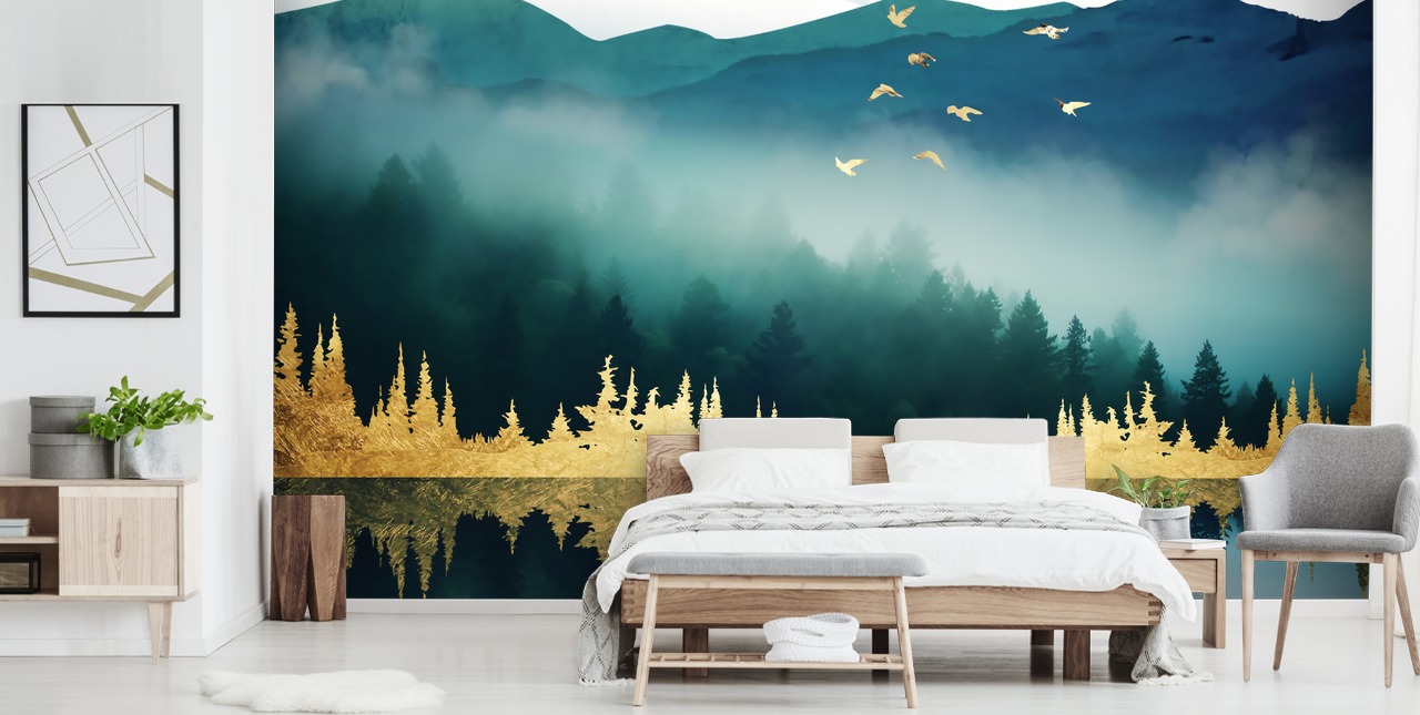 Hvis du vil skape en rolig følelse i hjemmet ditt, må du vurdere dette fantastiske Mist Reflection tapetet. Laget av SpaceFrog Design, vil dette vakre blågrønne og gullfargede tapetet lage en fantastisk funksjonsvegg i ethvert rom, for eksempel en stue. Plasser dette marine- og gulltapetet bak sofaen din slik at de gullfargede trærne og grønne fjellene vises. Mal veggene rundt i en lysegrå eller off-white nyanse og ha et utvalg av gulltilbehør overalt, for eksempel en lampe eller dørhåndtak.