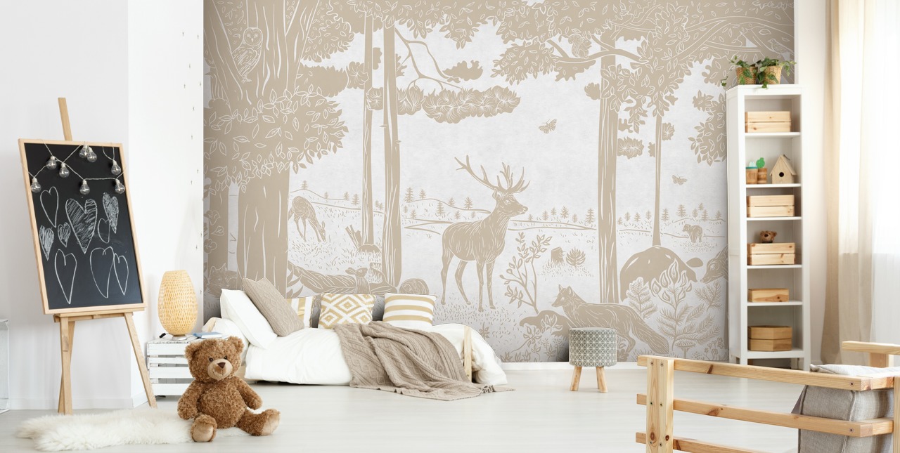 Monochrome Forest - Vintage White er et sjarmerende veggmaleri for barn som vil lyse opp rommet deres og gi det perfekte bakteppet til leketid.