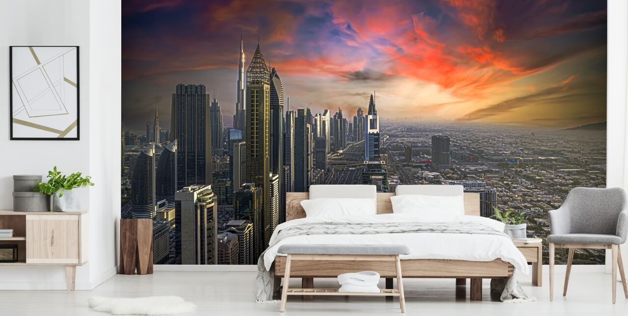 Ta med farger og fantastisk utsikt inn i hjemmet ditt med dette skreddersydde Pink Skies in Dubai-tapetet! Det perfekte Dubai-tapetet for en stue, hjemmekontor, soverom og mer.