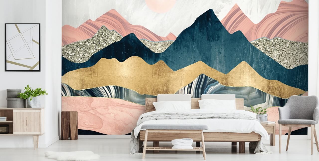 Ta med et elegant, moderne utseende inn i hjemmet ditt med dette stilige Plush Peaks veggmaleriet. Med nydelige toner av rødme rosa, blekkblå og gull, vil dette fantastiske landskapet tapet sikkert bringe farge og stil inn i ethvert rom.