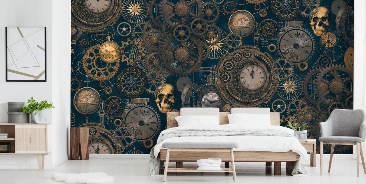 Dette fantastiske Steampunk-tapetet er den perfekte funksjonsveggen for en kul stue. Vi tror at dette mørke hodeskalletapetet ville gi en episk uttalelse med romtilbehør i gult gull. En gulllampe, gulldørhåndtak og en mørkegrå sofa ville se perfekt ut.