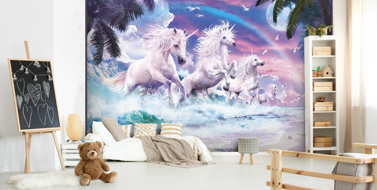 Hva et fantastisk syn å se i denne fantastiske Unicorn Waves tapet! Vi elsker blandingen av hvitt med turkis og pastelllilla - slik en nydelig enhjørning tapet for ethvert barn eller voksen soverom!