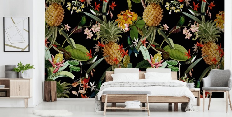 Ananas, fugler og blomster Mørk Bakgrunn