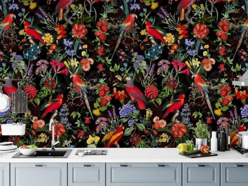 røde papegøyer og fargerike blomster på svart bakgrunn