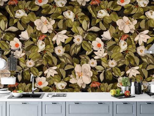 vintage eksotiske peoner og tropiske frukter natt hage tapet