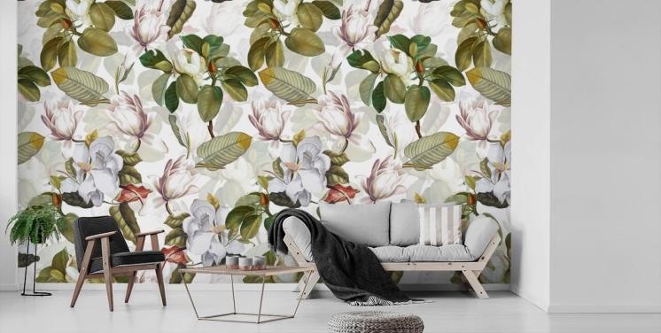 hvite magnolia blomster, grønne blader, hvit bakgrunn tapet