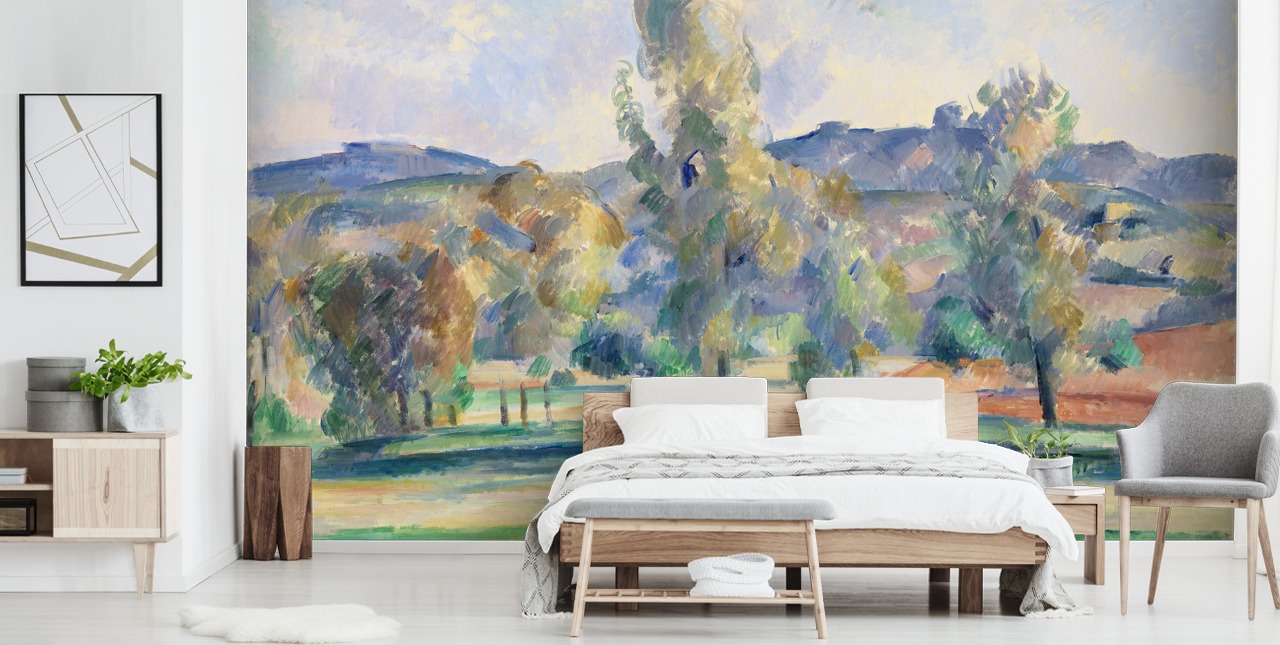 Fyll hjemmet ditt med høstens rike, gyldne toner med Paul Cezannes tapetmaleri Autumn Landscape.