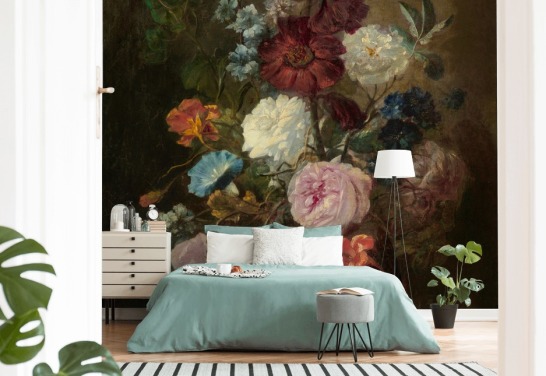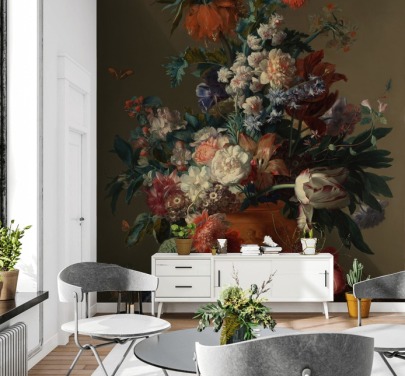 blomsterkunsttapet kalt Stilleben med blomster og en klokke av Abraham Mignon for stuer og soverom