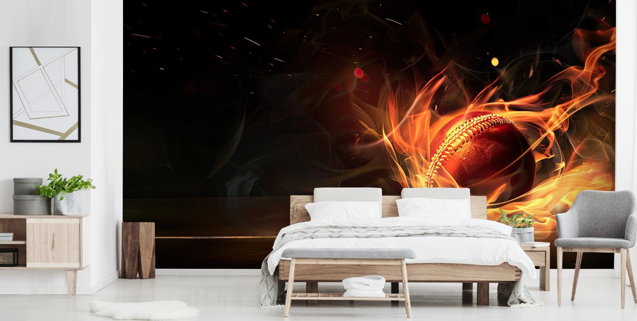 Gi liv til dramaet og magien til cricket i hjemmet ditt med dette slående Cricket Ball on Fire veggmaleriet fra Wallsauce.