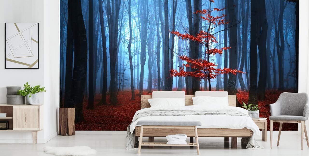Pryder hjemmet ditt med dette fargerike høstrøde og blå tapetveggmaleriet. Skreddersydd for å passe veggen til perfeksjon.