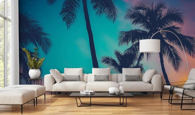 svart palme silhuetter mot blå, rosa og oransje himmel tapet