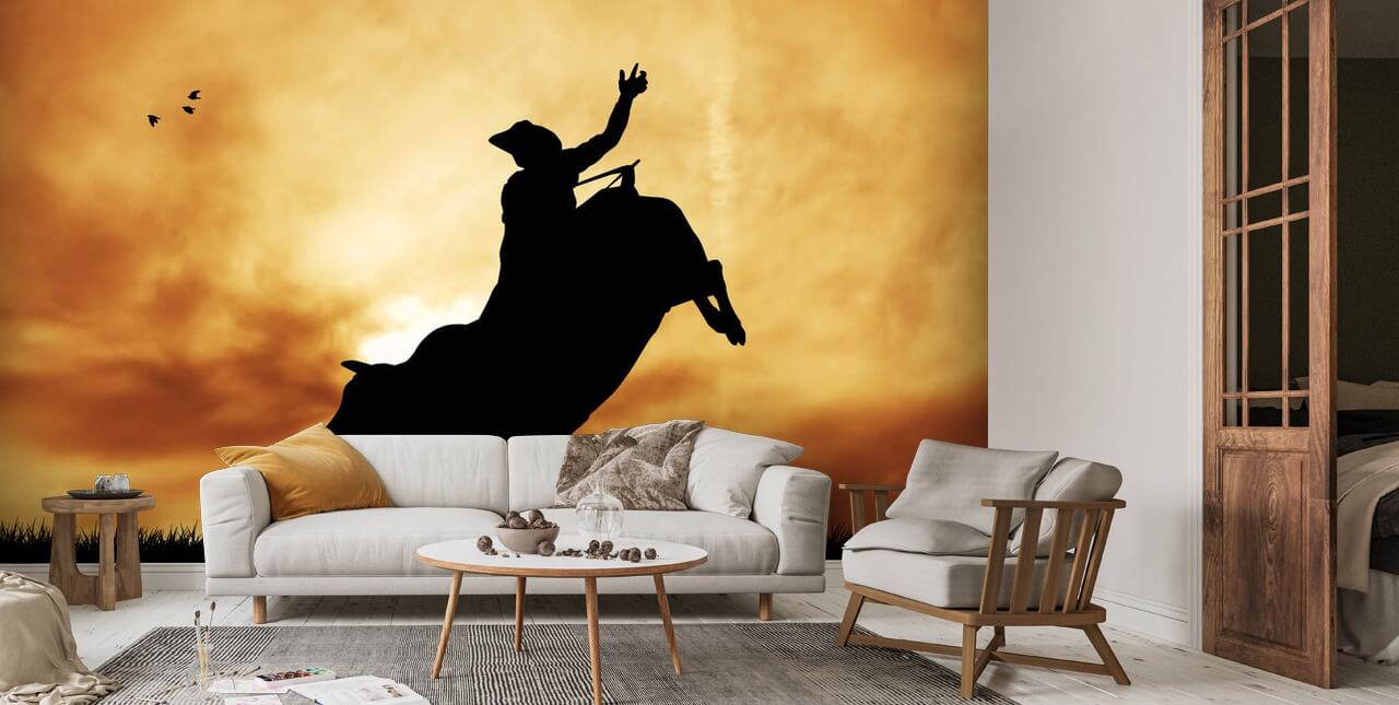 Fantastisk Bull rytter ved solnedgang veggmaleri fra Wallsauce. Denne høye kvaliteten Bull rytter ved solnedgang tapet er skreddersydd til dine dimensjoner. Enkel å bestille og installere pluss .