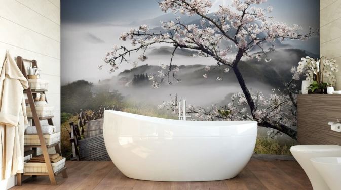 tåkete gangvei på fjelltoppen med tapet av kirsebærblomster kalt Japanese Walkway for kontorer