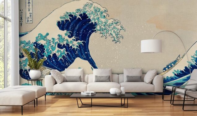 blått tilpasset orientalsk tapet kalt The Great Wave off Kanagawa for soverom og stuer