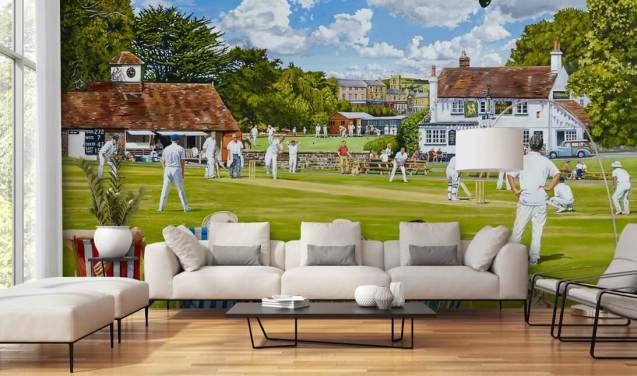maleri av cricketgrønt og folk som ser på i solstoler tapet