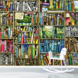 fargerikt tilpasset barnebokhylle tapetmaleri kalt Bookshelf av Colin Thompson for barnas soverom eller lekerom
