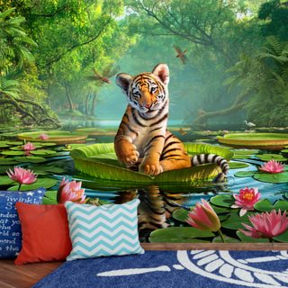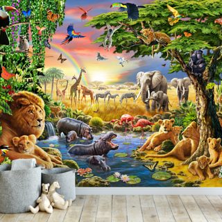 fargerikt tilpassbart dyretapet veggmaleri kalt Waterhole av Adrian Chesterman for barnas soverom