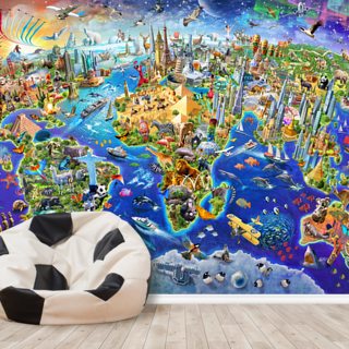 fargerikt tilpassbart verdenskart tapetmaleri kalt Political World Map av Lovell Johns for kjøkken og soverom