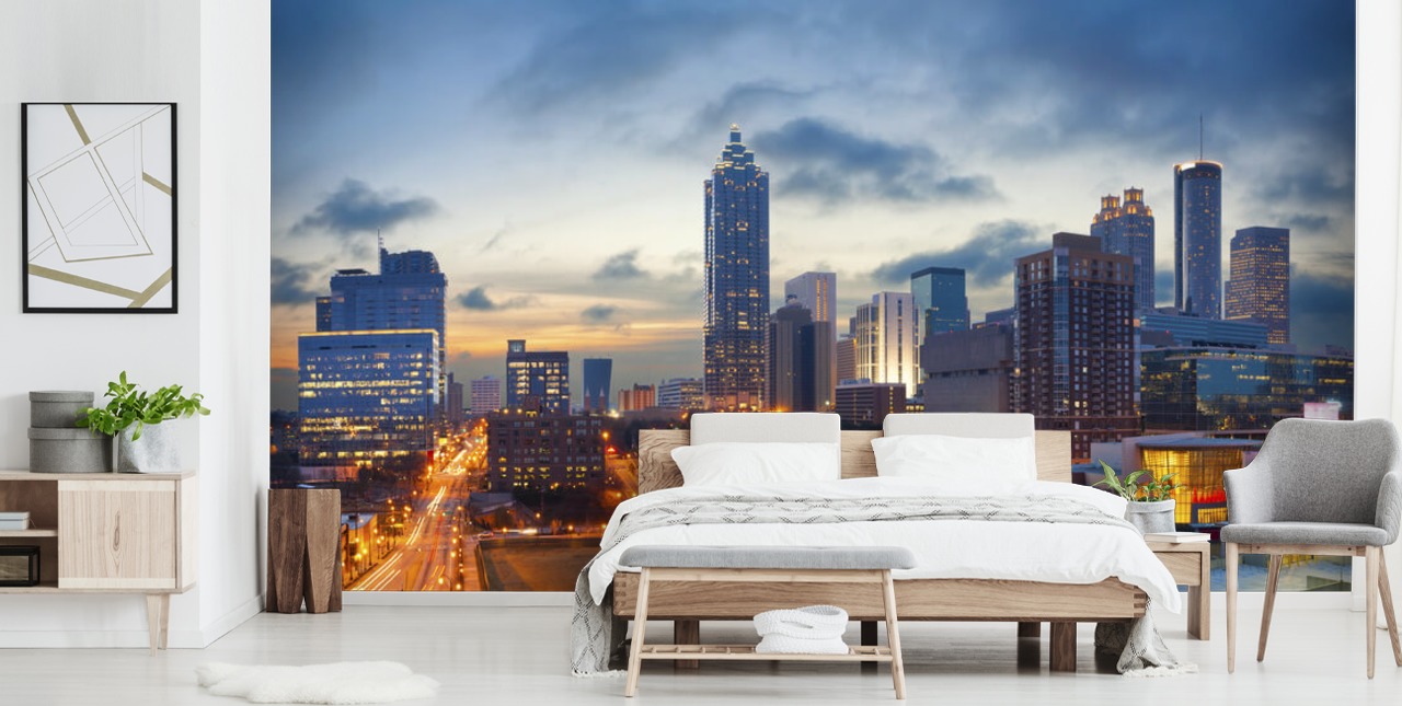 Forvandle hjemmet, kontoret eller virksomheten din med det fantastiske City of Atlanta kveldstapet veggmaleri. Dette vakre veggmaleriet fanger den livlige skylinen til denne ikoniske amerikanske byen når solen går ned, og gir en fengslende atmosfære til enhver vegg.